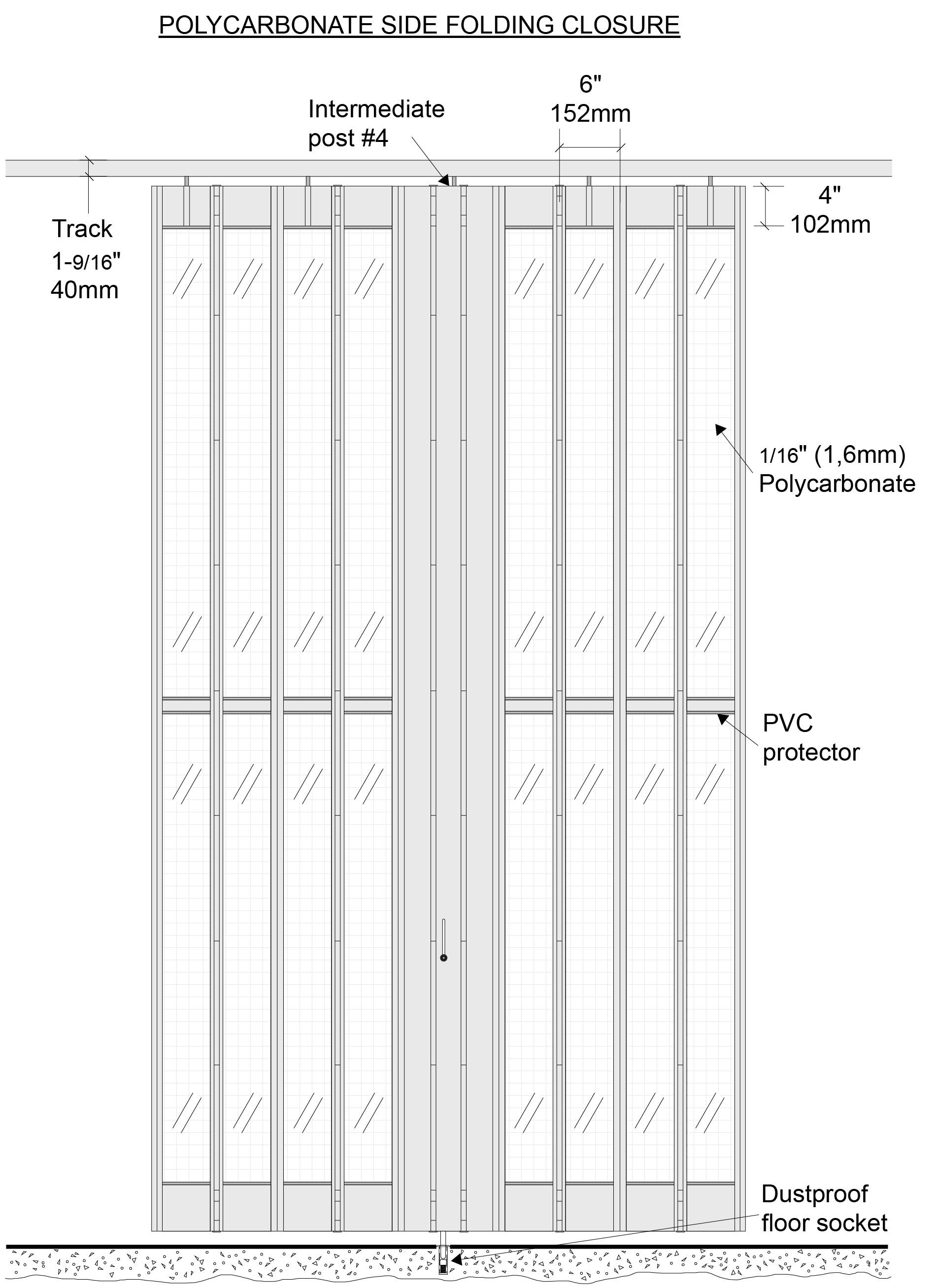 Folding Aluminum Closure model "Impact" Highly Resistant, Surprisingly Light. Polycarbonate panels provide remarkable impact-resistance in a surprisingly light package. The panels are 1.6mm (1/16") thick.