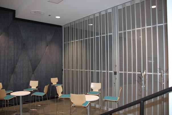 Folding Aluminum Closure model "AeroFlex" The Transparency of Glass... and Much More. Breathe easy with AEROFLEX micro perforated steel panels. This model combines the transparency of glass with the strength of steel for good-looking protection.