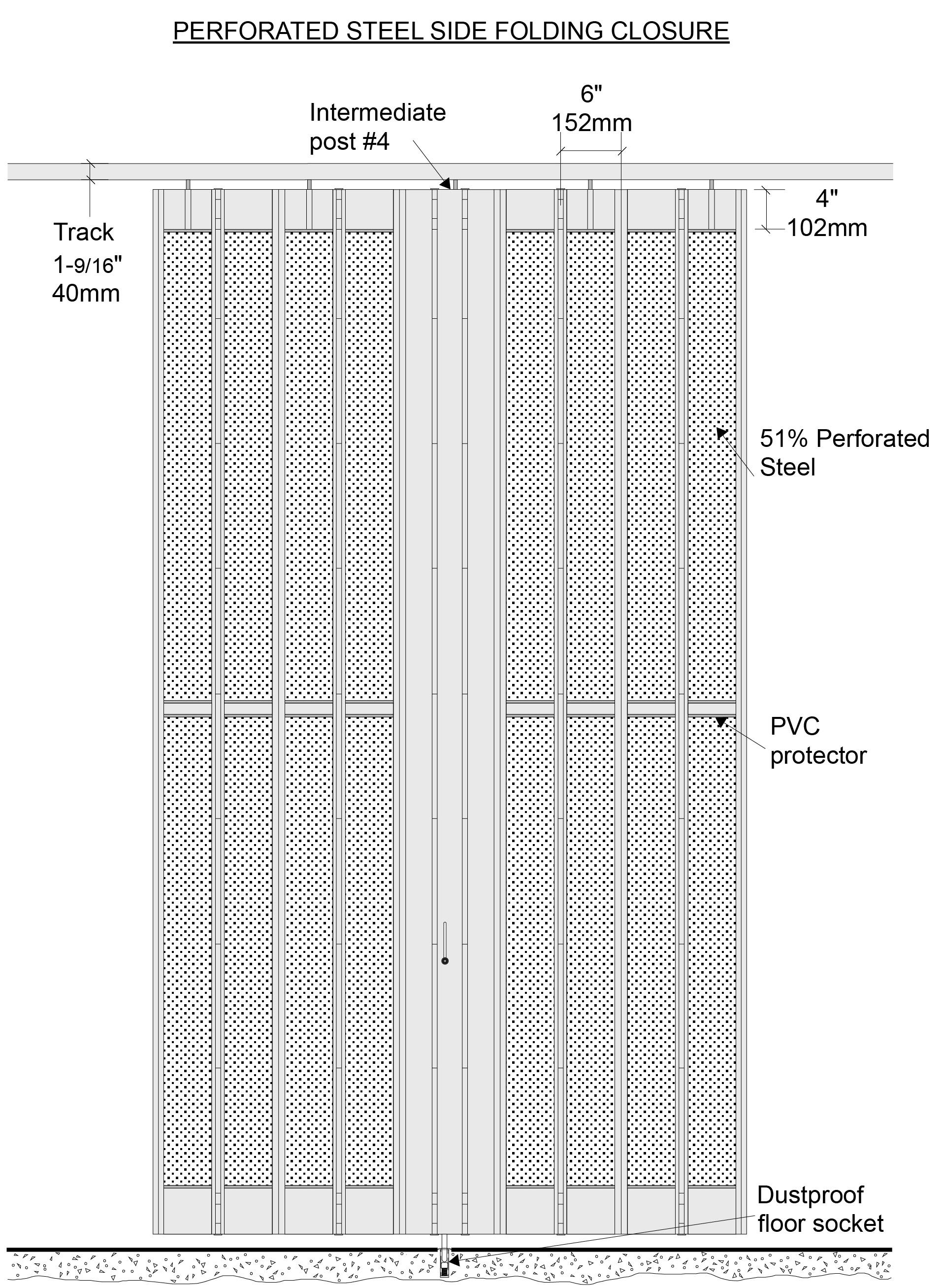 A. The curtain is constructed of 6” (152mm) wide modules linked together by a continuous aluminum hinge. These hinges hold steel perforated panels with 3/16” (5mm) diameter holes providing a 51% visibility and ventilation through the panels. The top and bottom of each section is fitted with an aluminum panel 4” high (102mm). This panel consists of an aluminum extrusion 1/16” (1,6mm) thick and composed of modules with a 15° angle between them to facilitate the operation of the closure.